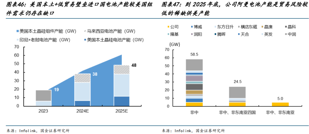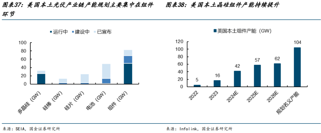 巨大的补贴力度叠加组件环节产能投资额低、建设速度快,这就导致美国本土的组件产能快速增加,根据infolink统计,2024年美国本土晶硅组件产能约42GW(名义产能达到104GW),较2023年底增长153%;预计到2025年底,美国本土组件产能将接近60GW,同比增长43%。