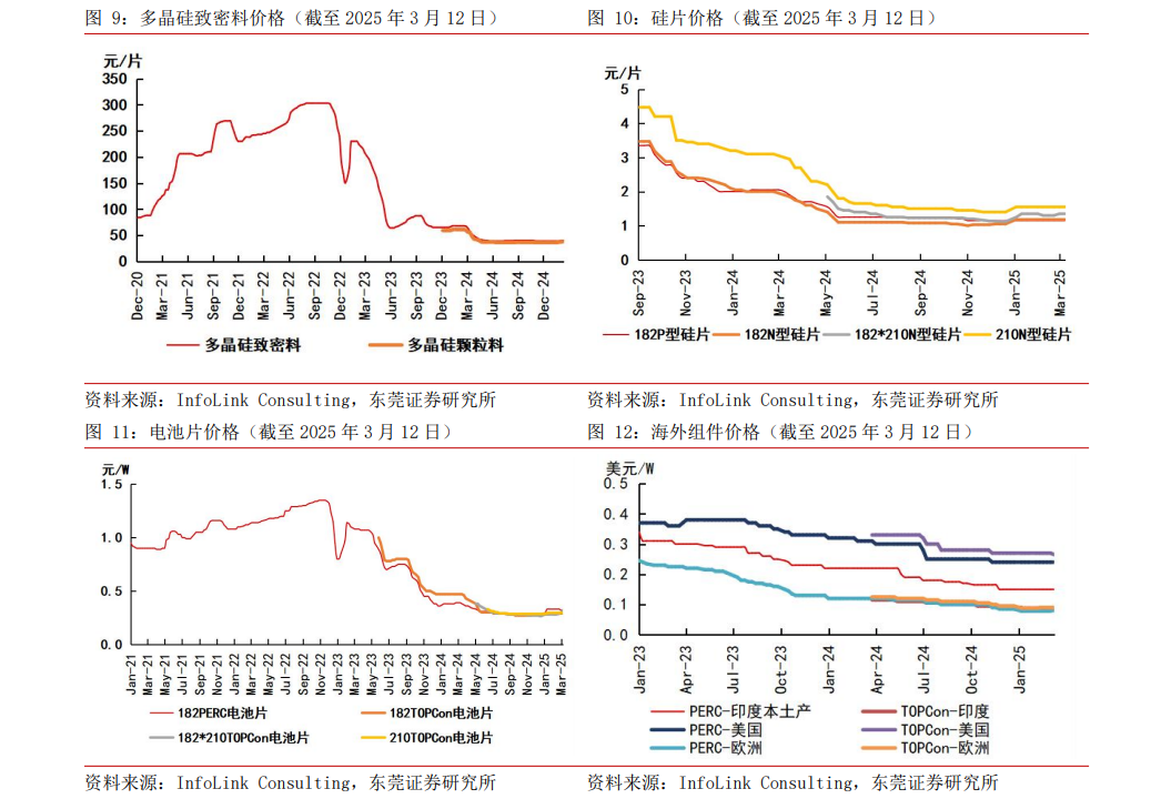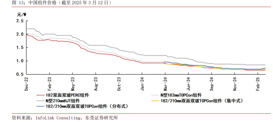 供给过剩,产业链价格一路下滑。2024年,光伏产业链供需矛盾尤为尖锐,产品价格大幅下跌。N型硅料均价在2024年底到达40元/kg以下,组件价格也下滑到0.6元/w的超低价。相关研究预计2025年硅料可支撑组件产出约为804GW,而需求仅为660GW,供需差仍然较大,即便是近期分布式光伏抢装,也不能扭转组件端供给依旧过剩的局面。组件环节需聚焦于行业产能的整合与出清,头部企业或将通过构建联盟提升行业集中度,从而修复组件议价能力。