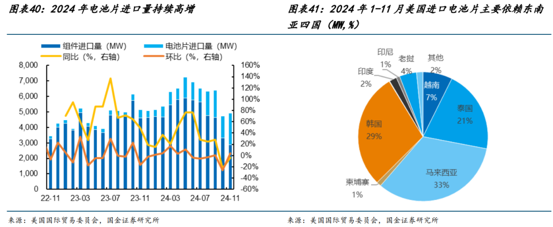 截至目前,东南亚四国产能需要承担201关税、反补贴税率、反倾销税率,最终东南亚四国相关企业的输美产能税率在30%-300%不等,较高的税率阻碍了东南亚四国电池片出口至美国的经济可行性。也就是说,美国本土电池片产能的不足,只能通过中国和东南亚四国以外的其他国家产能来补足。