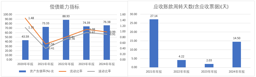 钧达股份进入光伏领域后,资产负债率就大幅提升,2024年的资产负债率达到76.38%,仅次于2022年的88.93%,同比2023年提升接近2个百分点;流动比率从2023年的1.08降低到2024年的0.99,速动比率从2023年的0.97降低到2024年的0.91。流动比率低于1,表明公司的流动资产不足以完全覆盖流动负债,可能存在短期偿债压力,核心原因还是行业竞争加剧下,公司的资金回笼速度减慢,应收账款周转天数增加。