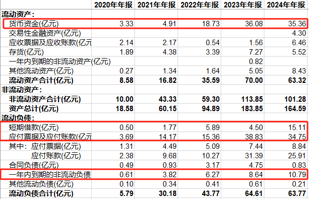 截至2024年末,钧达股份应付票据及应付账款34.75亿元,短期借款15.11亿元、一年内到期的非流动性负债10.79亿元,而同期公司的货币资金仅为35.36亿元,并不能完全覆盖。