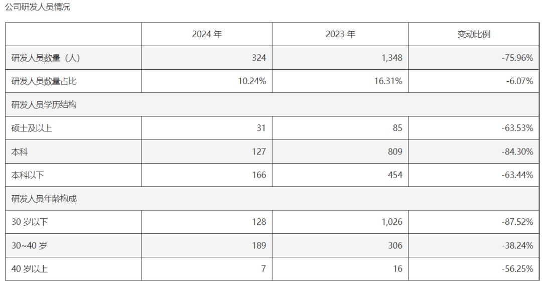 2024年钧达股份研发人员数量为324人,同比大幅减少1000余人,其中30岁以下研发人员从2023年的1026人减少到2024年的128人,30岁至40岁研发人员从306人减少到189人,40岁以上研发人员从16人减少到7人。