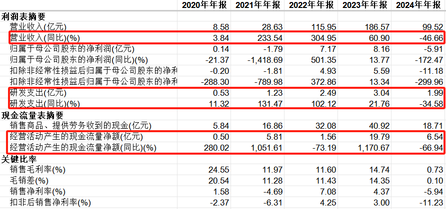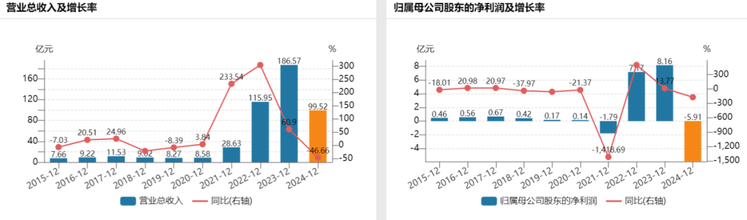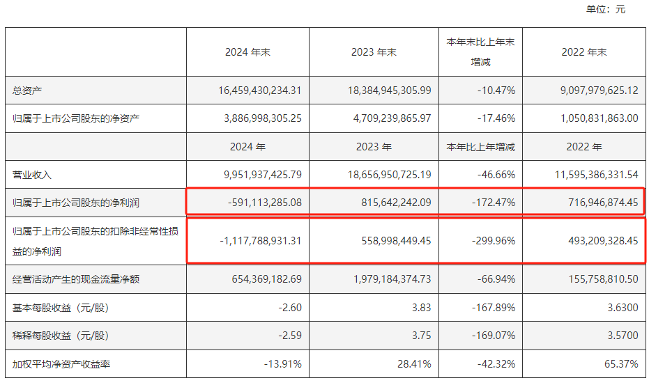 财报披露,2024年,钧达股份营收99.5亿元,同比下降46.7%;归母净利润-5.9亿元,扣非净利润-11.2亿元,净利润均由盈转亏。