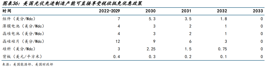 2022年8月拜登签署通过《通胀削减法案》(IRA),对符合条件的美国本土先进制造产能给予一定比例的税收抵免优惠,在IRA补贴下,本土制造的组件在2022-2029年可以享受0.07美元/W的税收抵免,相当于目前美国组件售价的25%-30%。