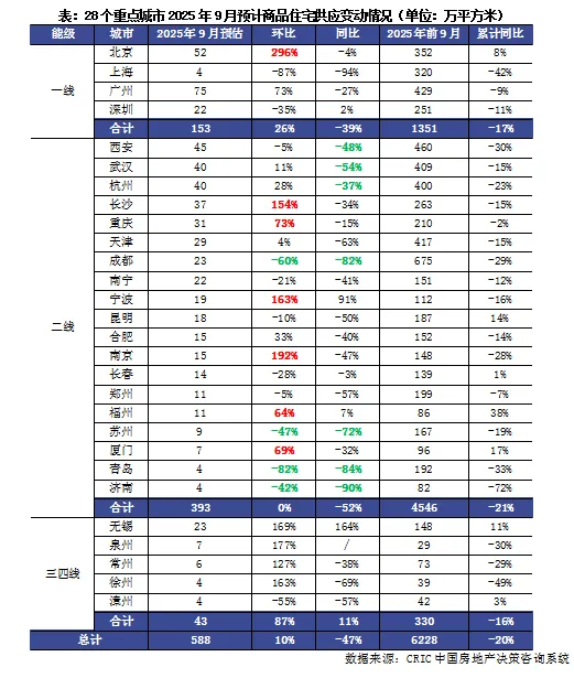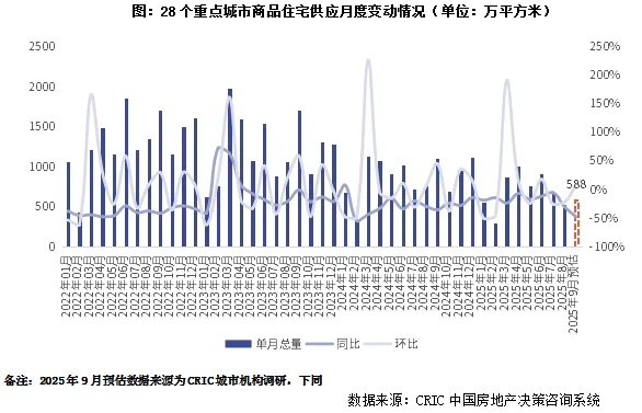 9月因恰逢传统营销旺季,房企推盘积极性稳步回升:据CRIC调研,9月28个重点城市预计新增商品住宅供应面积588万平方米,环比上升10%,同比下跌47%, 2025年前9月累计同比下降20%,短期内供给约束依旧显著。
