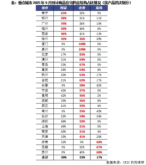 而从供应结构各产品档次分布来看,市场持续向改善需求倾斜:重点城市刚需、改善、高端占比结构为30%、53%和17%,呈现出以改善为主,刚需为辅的供应结构。