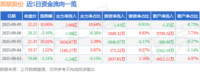 9月9日的资金流向数据方面,主力资金净流入2.66亿元,占总成交额18.64%,游资资金净流出1.41亿元,占总成交额9.91%,散户资金净流出1.25亿元,占总成交额8.73%。