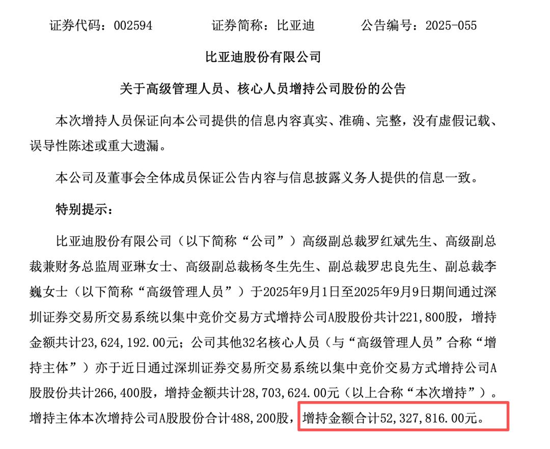 值得注意的是,在去年9月10日,比亚迪同样曾宣布,由高级管理人员、核心人员组成的增持主体在半年报披露后实施增持,增持金额合计3545.36万元。