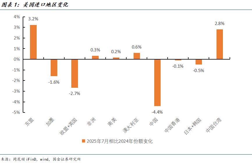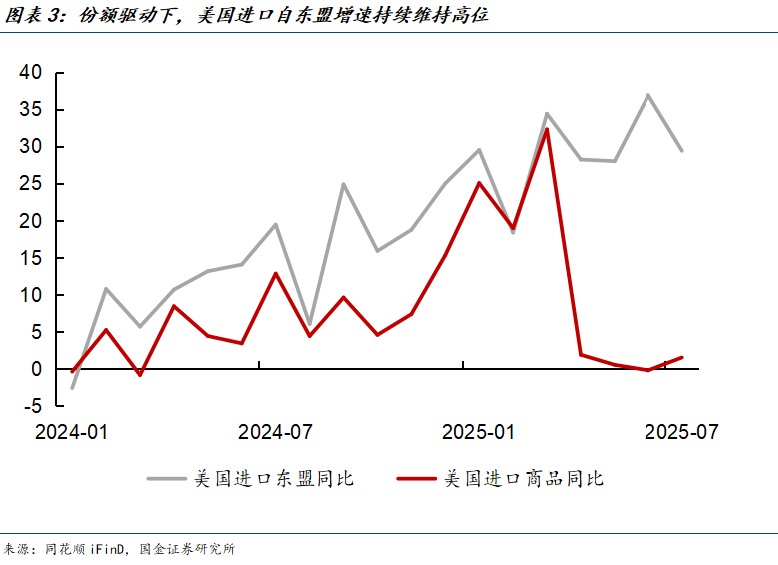 2025年7月中国占美国的进口份额相比于2024年回落4.4个百分点至9%,东盟占美国进口份额上升了3.2个百分点至14%。在份额的支持下,尽管4月以来美国进口需求大幅下滑,但美国进口自东盟的增速依旧维持在30%左右。