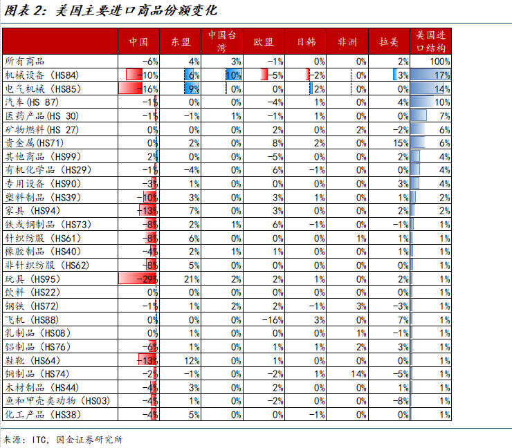 在这一轮美国发起的贸易战摩擦中,东盟、非洲等新兴市场国家是主要受益方,占美国进口的份额均有所提高,中国虽然失去了一部分美国市场,但是依靠着自身的产业链优势,在东盟、非洲等新兴市场国家份额均有所提高,也受益于当地经济发展。相反,日韩、欧洲等在这一轮关税贸易战中或面临更大的压力,高额关税下,其占美国市场份额面临下滑压力,在各类商品份额上也面临着中国、东盟等地区的挑战。