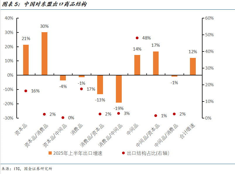 按照ITC口径,2025年上半年中国对东盟出口同比增长12%,资本品、中间品、消费品(按照HS6位数口径划分)出口同比增长21%、17%、-1%,中间品和资本品累计拉动对东盟出口同比增速10个百分点。
