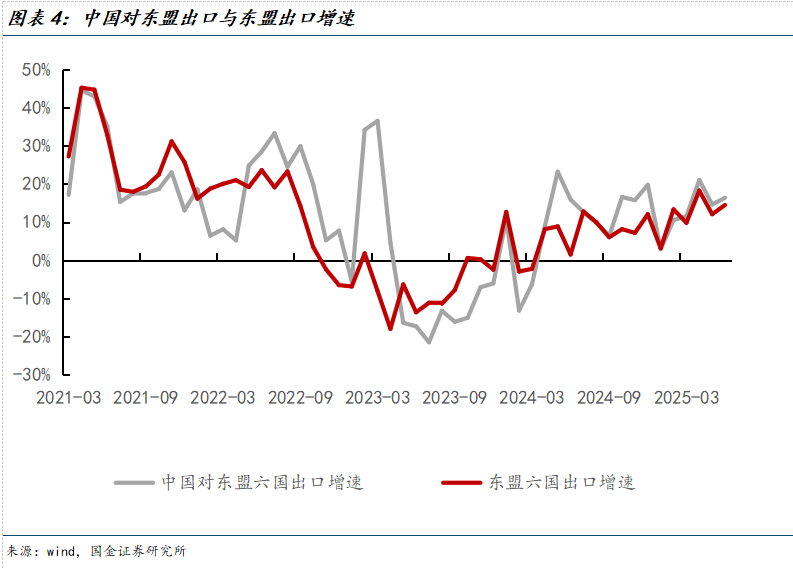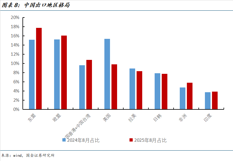 中国产业链对东盟、非洲的溢出,维持了中国出口的竞争力,让中国出口增速在关税落地的7、8月依然保持韧性。
