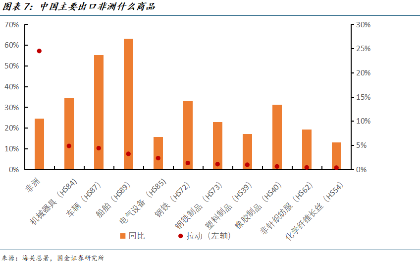 相比东盟,中国对非洲的出口更加多元化,出口目的地也更加均衡。分商品看,中国对非洲出口增速较高的主要有机械设备(HS84)、车辆(HS87)、船舶(HS89)、电气设备(HS85)、钢铁(HS72),分别拉动中国在非洲出口同比增长5、4、3、2、1个百分点。