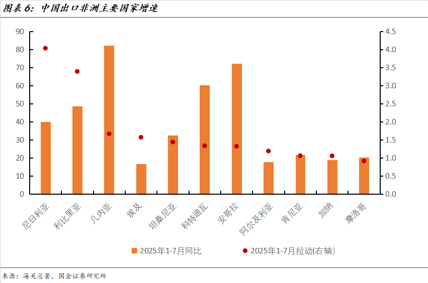 分国别看,2025年1-7月,中国对尼日利亚(占比中国在非洲出口10%)、利比里亚(占比7%)、几内亚(占比2%)的出口增速分别为40%、48%、82%,是主要出口的主要拉动国。