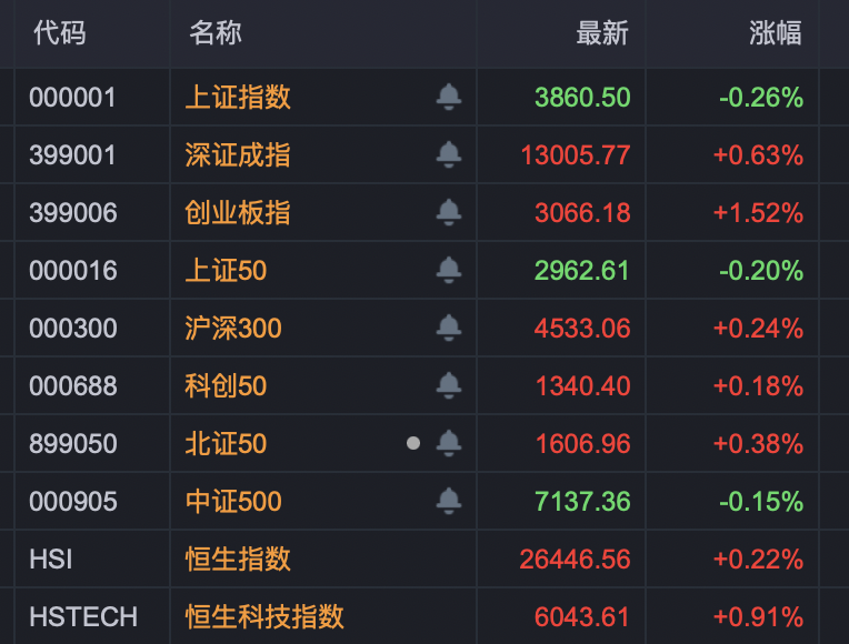 今日,A股小幅震荡,深证成指近3年来首次收在13000点之上;创业板指、沪深300亦创多年新高;上证指数、上证50则微幅飘绿。市场下跌个股远多于上涨个股,成交小幅萎缩至2.3万亿元。