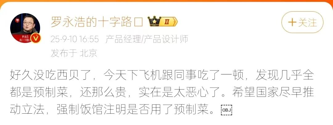 9月10日下午,罗永浩在微博中吐槽,“好久没吃西贝了,今天下飞机跟同事吃了一顿,发现几乎全都是预制菜,还那么贵,实在是太恶心了。希望国家尽早推动立法,强制饭馆注明是否用了预制菜。”