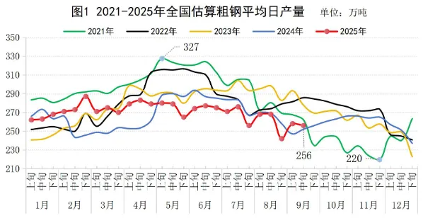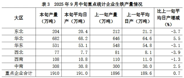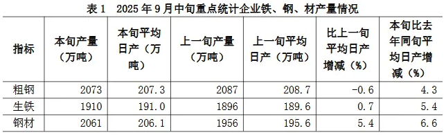 2025年9月中旬,重点统计钢铁企业共生产粗钢2073万吨,平均日产207.3万吨,日产环比下降0.6%;生铁1910万吨,平均日产191.0万吨,日产环比增长0.7%;钢材2061万吨,平均日产206.1万吨,日产环比增长5.4%(见表1)。