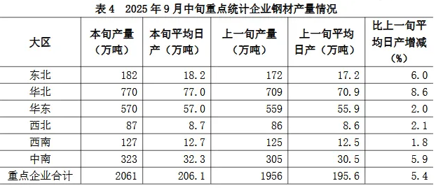 9月中旬六大地区重点统计企业钢材日产量均有不同程度增长(详见表4),具体为:东北地区钢材日产增加1.0万吨(+6.0%),主要与辽宁省日产增加1.3万吨(+10.5%)有关。