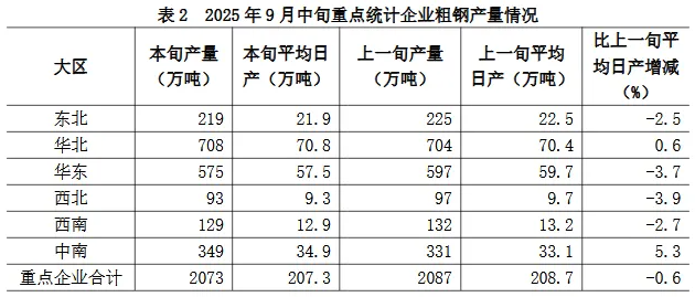 9月中旬六大地区中,除华北、中南地区重点统计企业粗钢日产量较上一旬有所增长外,其它地区均有不同程度下降(详见表2),具体为: