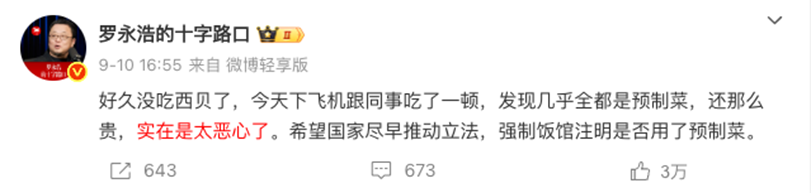 9月10日,罗永浩在社交媒体平台发文称,“好久没吃西贝了,今天下飞机跟同事吃了一顿,发现几乎全都是预制菜,还那么贵,实在是太恶心了。希望国家尽早推动立法,强制饭馆注明是否用了预制菜。”