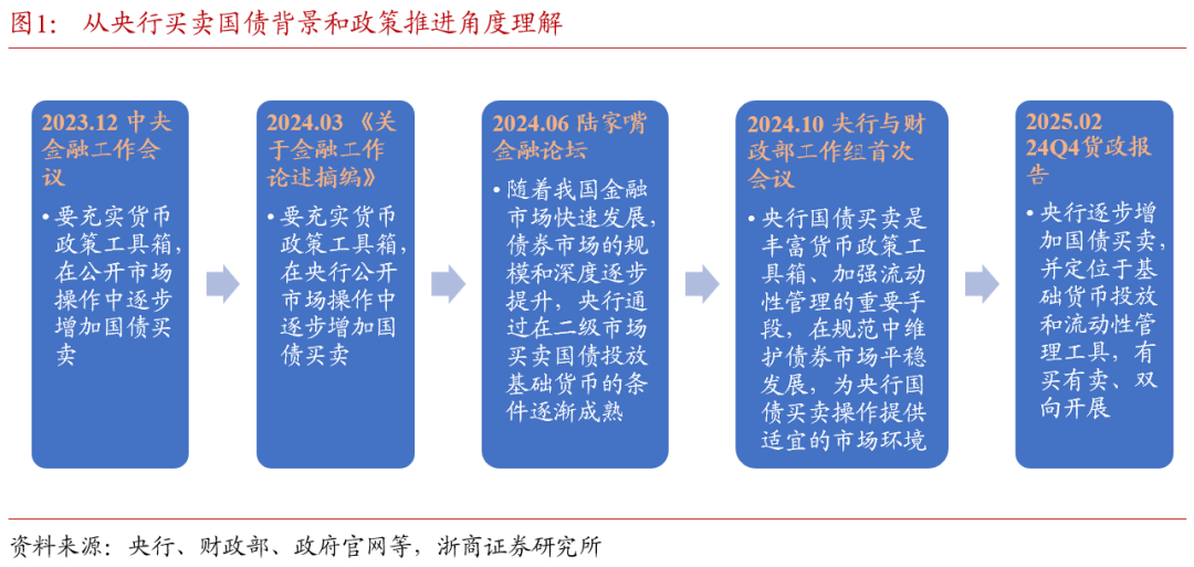 2025年2月,在央行暂停买卖国债后,24Q4货政执行报告依然提到央行逐步增加国债买卖,并定位于基础货币投放和流动性管理工具,有买有卖、双向开展;2024年累计净买入国债1万亿元,与其他工具综合搭配保持了流动性合理充裕。