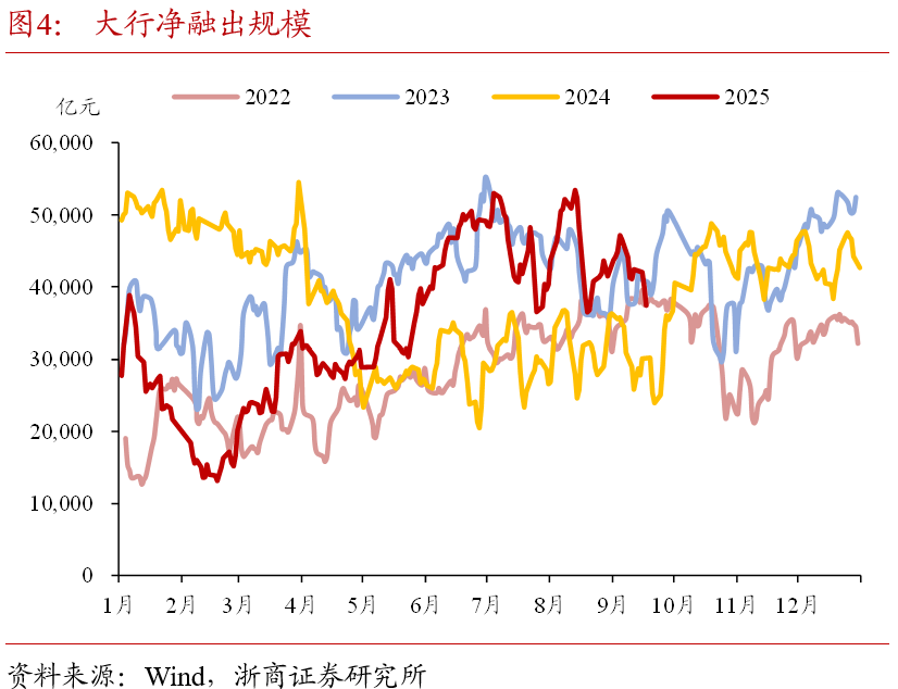 从制度设计的角度看,央行取消质押券冻结为央行买卖国债的同时降低政策成本奠定了基础。当前我国1年以内以及1-3年国债余额分别约5.93万亿元和8.83万亿元,规模不算小,但是参照前期央行半年累计净买入国债1万亿元的节奏,存量消耗或较快。此外,大行质押式逆回购净融出规模较高,由于质押式回购的质押品冻结在资金融入方账户,资金融出方不能随意使用,因此债券二级流动性变差,对标海外买断式为主的回购方式,资金融出方可以支配债券。而2025年7月央行征求意见稿取消对债券回购的质押券冻结,叠加近期大行从市场买入国债的期限从3年以内扩展到3年至5年,在制度设计更新的背景下,若后续央行再度重启买卖国债操作,大行从市场“扫货”压力会减小,对中短端利率的影响或系统性降低。