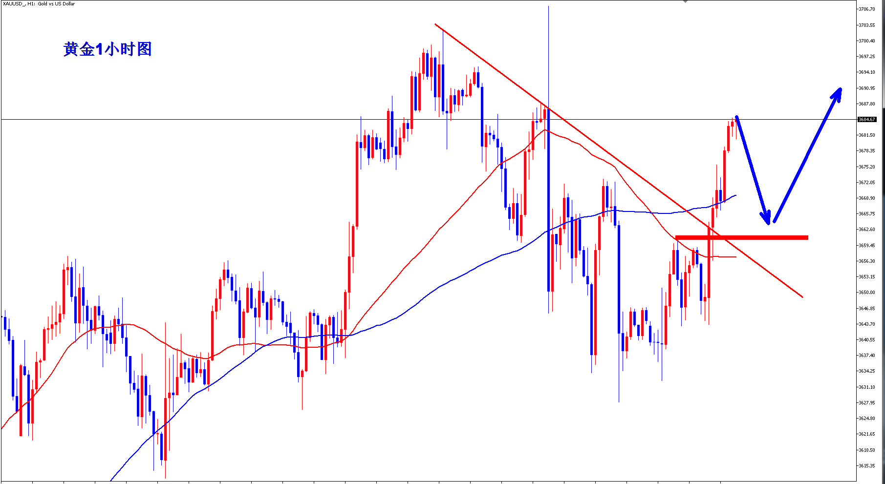 黄金1小时昨晚美盘突破下行趋势线,黄金开始向上突破,那么黄金多头的力度就加强了,黄金回踩还是继续顺势多,黄金短线支撑3662附近一线,黄金下周回踩3662上方继续逢低做多。黄金多头还将继续向上发力。
