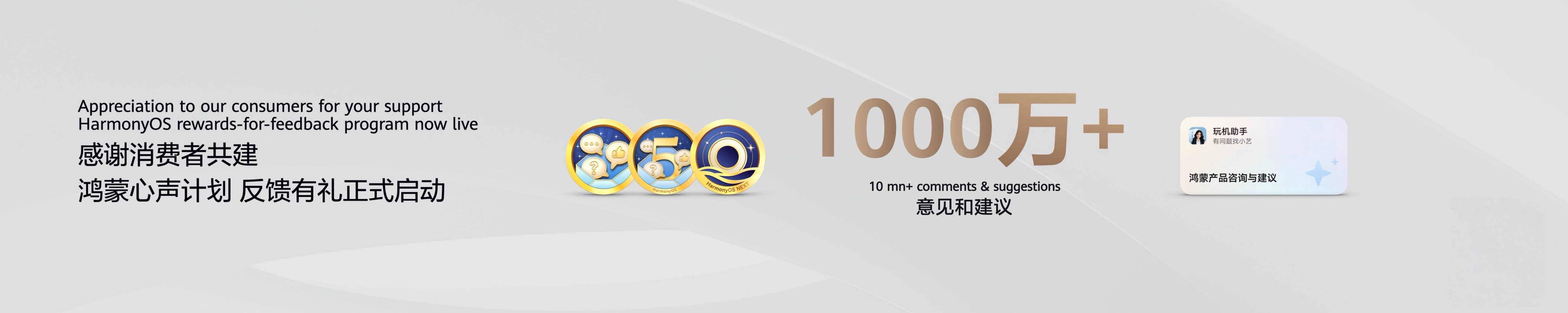行百里者半九十,鸿蒙仍在发展的路上,鸿蒙高度重视用户体验与反馈。目前已累计收到超过1000万条用户建议, 96%以上实现快速闭环,鸿蒙正在变得越来越好。伴随“鸿蒙心声计划——反馈有礼活动”上线,所有使用搭载HarmonyOS 5设备的消费者,每反馈一个问题或需求,不仅可以获得定制勋章,还有机会可以获得鸿蒙手机、平板等奖品。