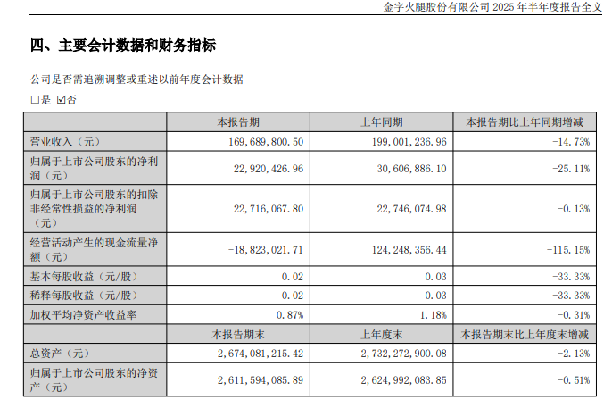 2025年上半年,金字火腿业绩面临较大压力。财务数据显示,2025年上半年,公司实现营业收入1.7亿元,同比下降14.73%;实现归母净利润2292万元,同比下降25.11%;实现毛利率24.97%,同比下降1.07个百分点;实现净利率13.23%,同比下降13.01个百分点。