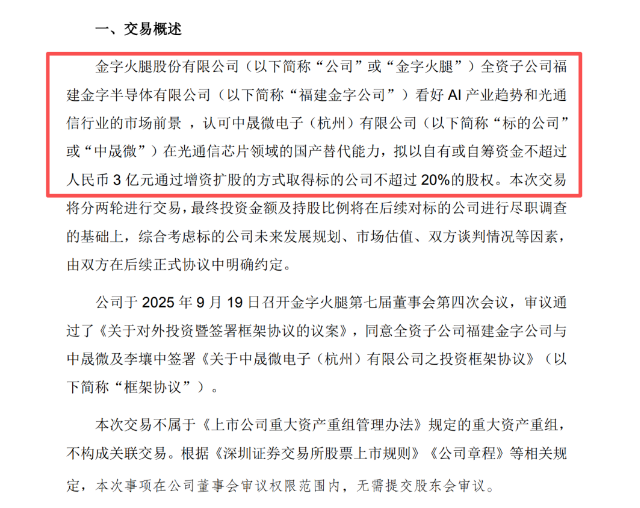 9月22日晚,金字火腿公告,公司全资子公司福建金字半导体有限公司(以下简称“福建金字公司”)看好AI 产业趋势和光通信行业的市场前景,认可中晟微电子(杭州)有限公司(以下简称“中晟微”)在光通信芯片领域的国产替代能力,拟以自有或自筹资金不超过3亿元通过增资扩股的方式取得标的公司不超过20%的股权。