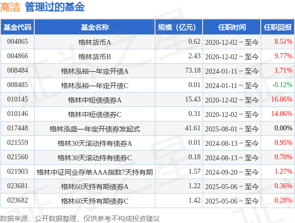 高洁女士:中国国籍,美国旧金山大学金融分析硕士,研究生,曾任吉林银行金融市场部债券交易员,民生银行直销银行事业部基金类产品经理,中英益利资产管理股份有限公司固定收益部投资经理,2020年5月加入格林基金,曾任固定收益部基金经理助理,现任固定收益部基金经理。2020年12月2日起担任格林日鑫月熠货币市场基金基金经理。2024年1月11日起担任格林泓裕一年定期开放债券型证券投资基金基金经理。现任格林30天滚动持有债券型证券投资基金的基金经理。现任格林中证同业存单AAA指数7天持有期证券投资基金基金经理。2025年8月1日起任格林泓盛一年定期开放债券型发起式证券投资基金的基金经理。