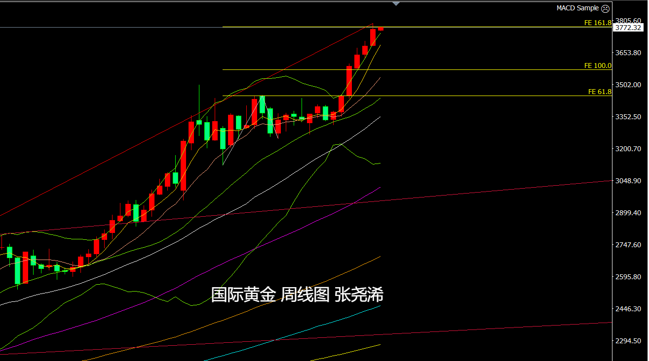具体走势上,金价自周初开于3686.98美元/盎司,先行录得当周低点3683.62美元,便开始反弹走强,如期触及看涨目标位,并于周二录得当周高点3790.68美元,也即是新的历史高点后,遇阻回撤至3717附近,之后则连续震荡走盘,并有所回升收复跌幅,最终收于3762.45美元,周振幅107.06美元,收涨75.47美元,涨幅2.05%。