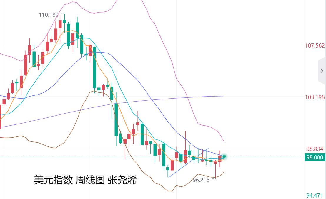 周图,金价自去年开涨攀升以来,如期第4次回踩中轨线支撑,并再度向上攀升,且不断触及给出的看涨目标位,虽目前多头在目标阻力位附近有所减弱和回撤,短期面临一定调整回落走低行情,但整体的看涨趋势依然未有改变,故此,如有进一步调整,下方5-10周均线也是再度入场看涨机会,但如继续反弹运行在阻力位附近或上方收线,则可继续跟进看涨。