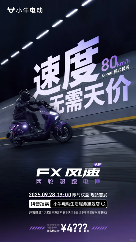 还在被城市早高峰的车流困住,眼看打卡时间临近却寸步难行?全球高端智能电动车领导品牌小牛电动即将带来破局方案——FX风速电摩9月28日19:00现货首发,以3000W大功率电机为核心,重新定义城市通勤的速度边界!这款被业内称为“两轮超跑电摩”的新品,Boost模式极速可达80km/h,红绿灯起步瞬间即可轻松甩开同级别车型,让原本枯燥的通勤路变成充满激情的“追风时刻”。​