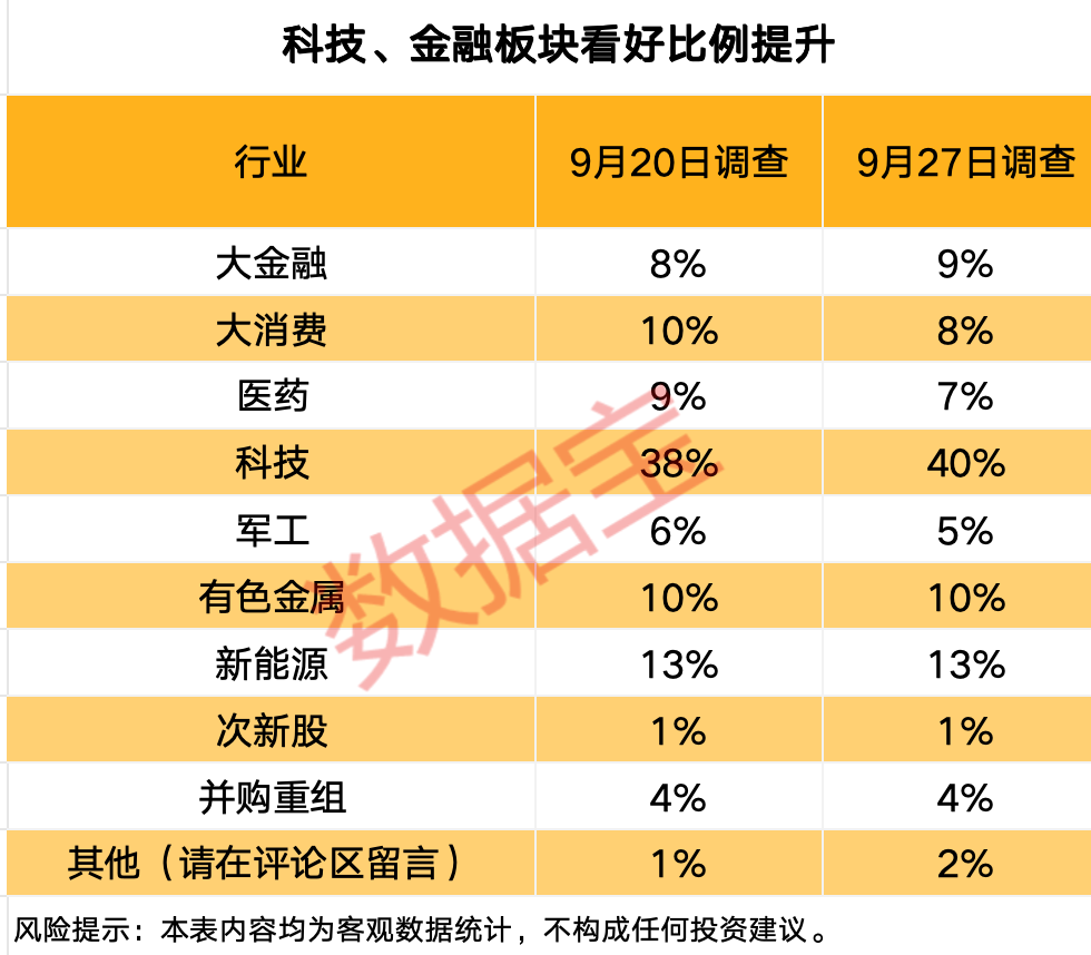 对于下周A股市场的潜力板块和方向选择,科技、金融板块分别环比提升2个百分点、1个百分点,最新分别为40%、9%,是受访者较为看好的板块。大消费、医药板块则均环比下滑2个百分点,最新分别为8%、7%。