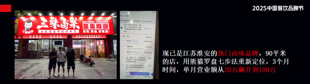 我们给这家店做了重新定位,现在90平方米的店,单月营业额从20万元做到100万元。对于三味卤菜来说,不是没机会,而经营这家店的人以前没见过什么是好的店。调整定位后,三味卤菜用三个月实现了5倍增长。