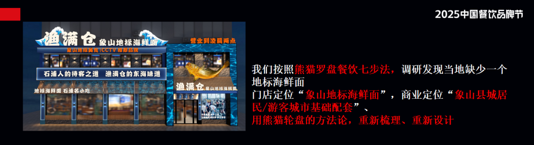 还有一个案例是宁波象山的渔满仓,我们帮他做了一家象山地标海鲜面,今年8月份开始试营业,第一天营业额达10万元,各种榜单排名都是第一名。很多人到店里充值,因为这些县城消费者认为自己的消费需要升级,市面上终于有一家高级一点的面馆了。