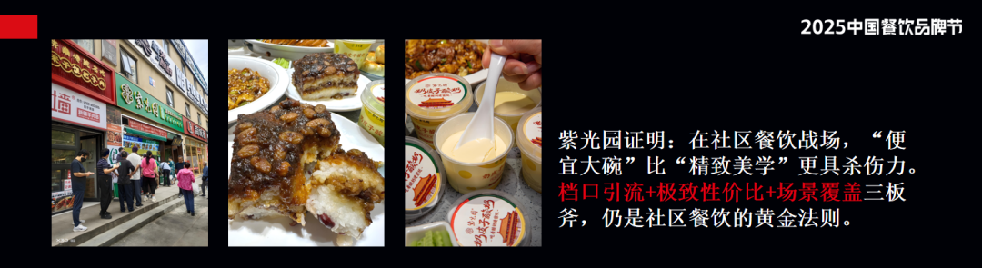 再如紫光园,它再次证明便宜大碗,在大多数时候都比精致美学更具备杀伤力。大家都在做漂亮饭,但是紫光园告诉我们,面对消费者真实的需求才是最重要的。我不用花钱参加任何的评选,只要伺候好门店后面这两个小区就够了。