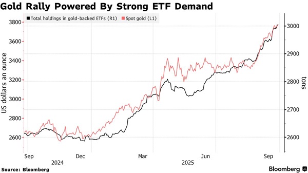 今年以来,金价已飙升逾40%,受央行需求和美联储重启降息的推动,金价屡创新高。黄金ETF持仓量达到2022年以来的最高水平。