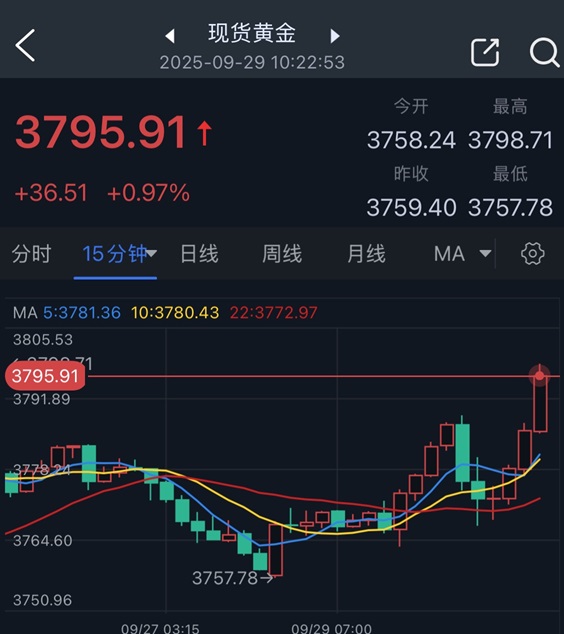 北京时间10:22,现货黄金报3795.91美元/盎司。