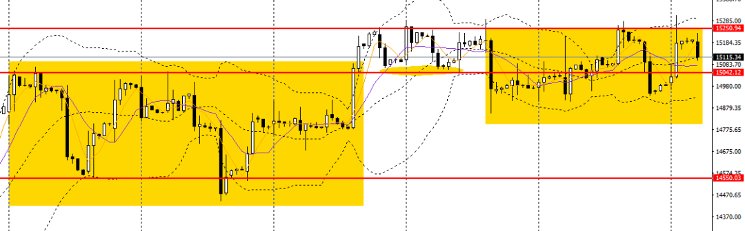 A50刺破前高,但未能正式站上15200一线阻力,日线继续围绕5日、10日均线震荡,4小时仍受困于14800-15200区间内,稳健者可保持观望。