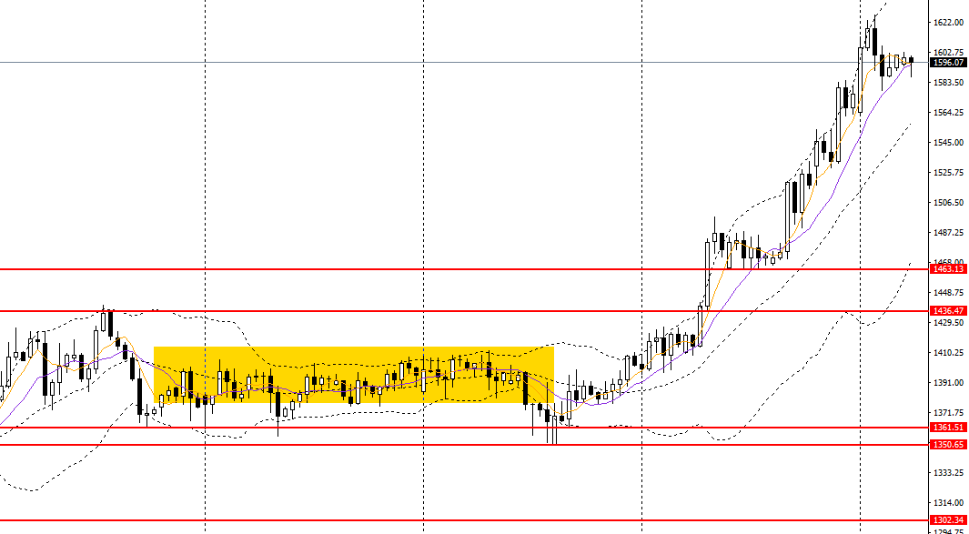 铂金连日拉升,仍立于日线布林上轨上方,4小时多头动能有所减弱,但整体趋势仍偏强,后市仍可上看至1630。