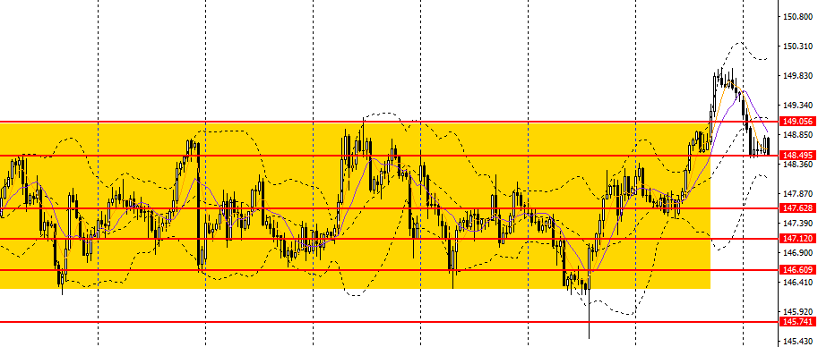 美日遭遇重挫,失守5日均线,日线RSI继续走低,4小时多次回踩148.50附近支撑,短线趋势仍偏弱,空单仍可持有,如进一步下破,可下看至148。