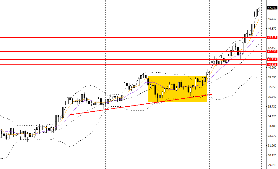 白银日线呈前进三兵,日线RSI仍位于超买区,4小时呈空中加油,有望实现进一步上破,46.60上方可维持低多思路,后市预计将挑战48.20。
