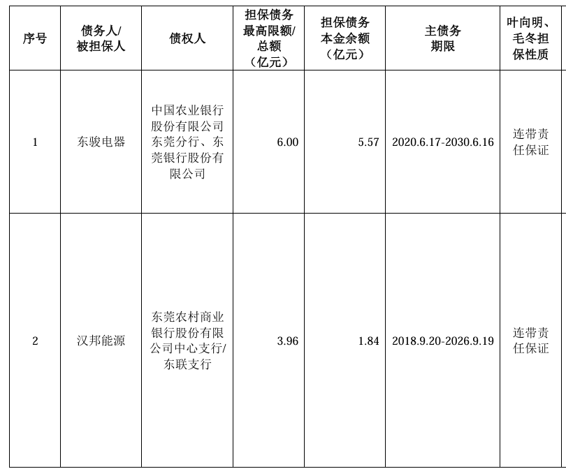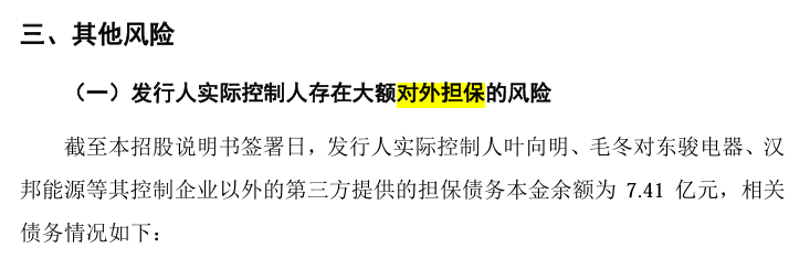 招股书显示,截至招股说明书签署日,莱普科技实际控制人叶向明、毛冬对东莞东骏电器有限公司(以下简称“东骏电器”)、东莞市汉邦能源有限公司(以下简称“汉邦能源”)等其控制企业以外的第三方提供的担保债务本金余额为7.41亿元,其中东骏电器担保债务本金余额5.57亿元、汉邦能源担保债务本金余额1.84亿元。