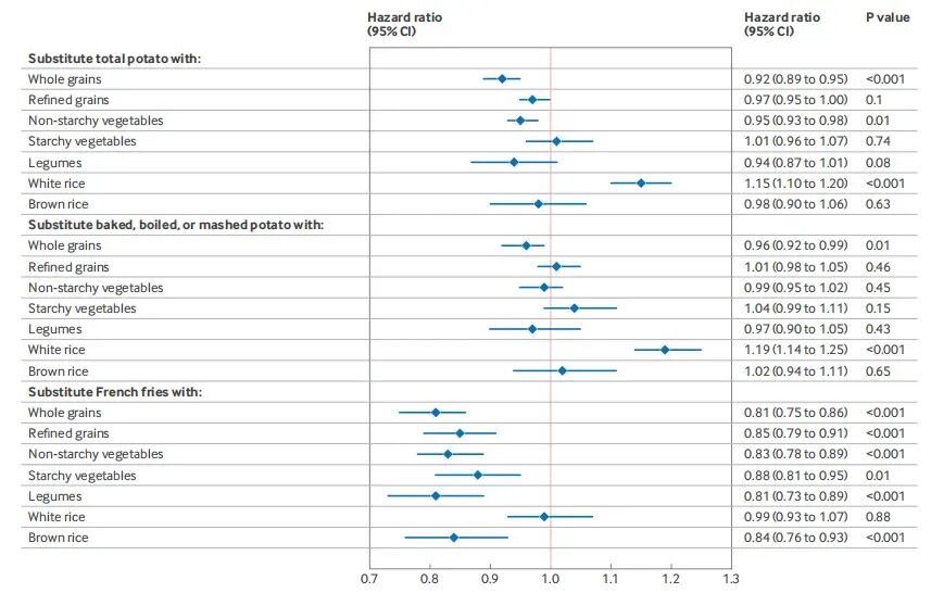 图2模型显示,将三份/周总土豆换为全谷物,风险下降8%(95%CI 5-11%);若仅替换薯条,降幅升至19%(14-25%)。换豆类、非淀粉蔬菜亦分别降低17%与15%,但换白米反而升高风险(HR 1.15)。作者强调,土豆对健康的影响取决于它替代了哪种食物。