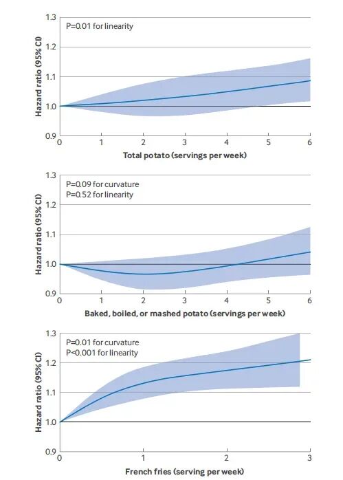 把三类土豆合并后,三份/周总摄入对应风险+5%(HR 1.05,1.02-1.08;图1A)。曲线无平台期,提示风险随剂量累积而非阈值效应。