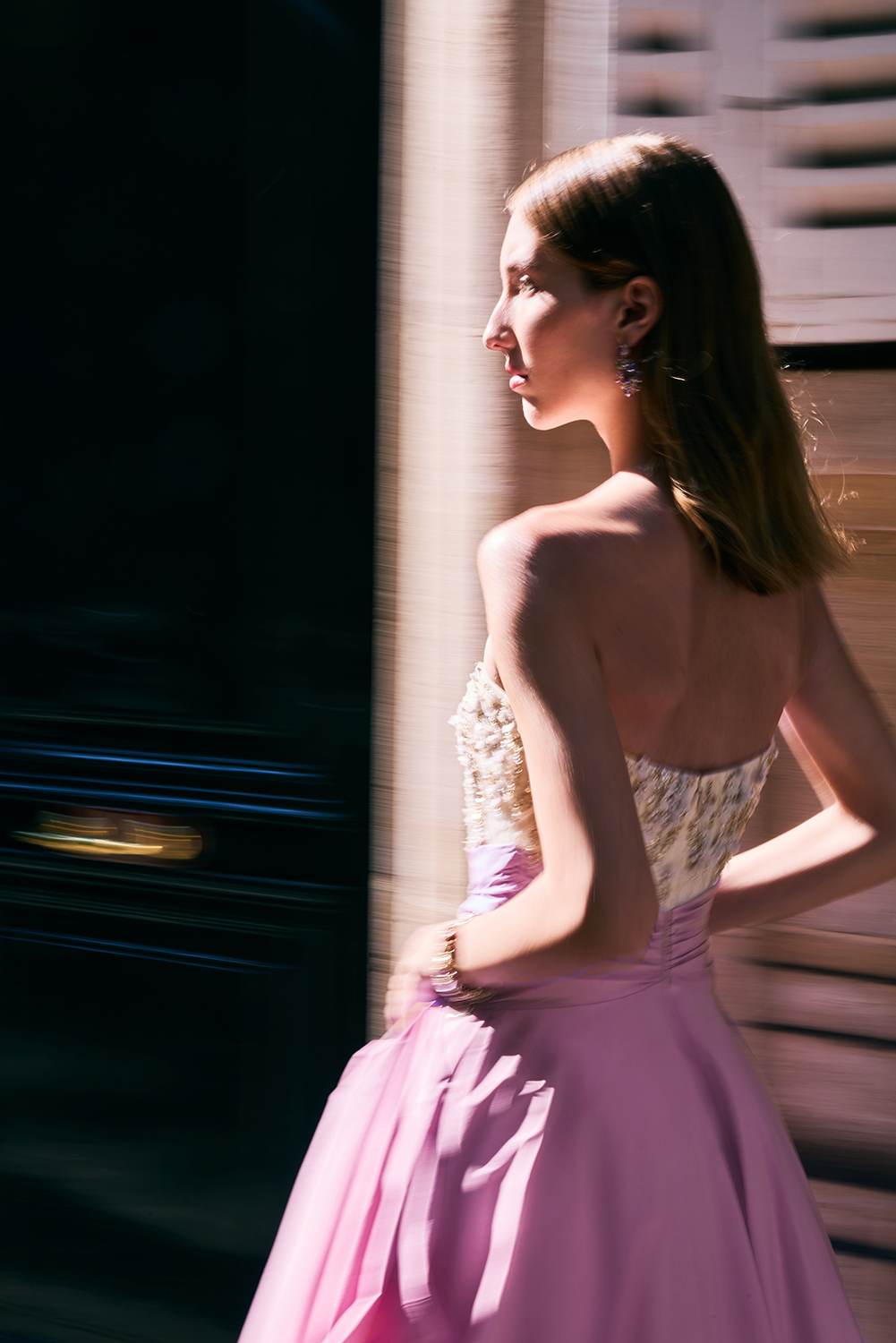 La Koradior从抽象表现主义的狂放笔触中汲取灵感,将看似随性实却精妙的线条通过立体剪裁呈现于简洁的直身或裹身廓形之上。品牌标志色La-purple与裸色系连衣裙及套装相映成趣,搭配质感缎面与塔夫绸,以举重若轻的手法诠释出兼具轻盈与力量的艺术气质,致敬雕塑感般的女性生命力。