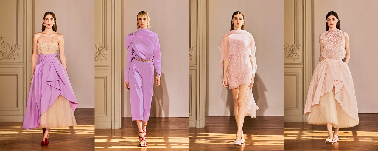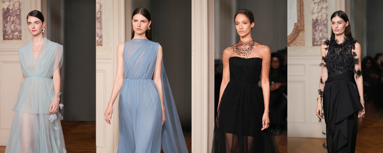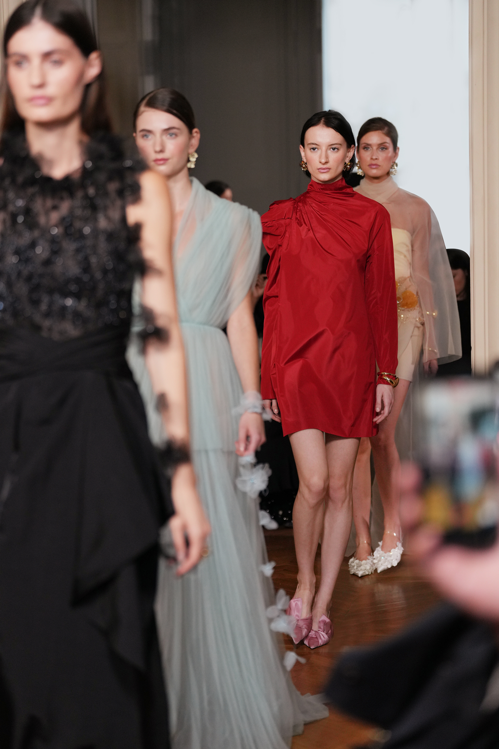 La Koradior以实验性光影美学为引,借助直接曝光所形成的抽象涟漪与色彩,呼应无拘无束的自由运动概念。该理念与手工褶皱长裙、轻盈薄料及柔和色调完美契合,斗篷裙款、精致刺绣与垂坠结构进一步凸显定制之美。压轴部分融入新古典主义的灵性审美,以隆重袍袖、席地礼服与浓郁红色系升华全场,将诗意与结构、艺术与时装完美结合,致敬经典亦面向未来。