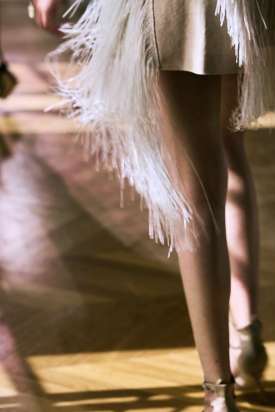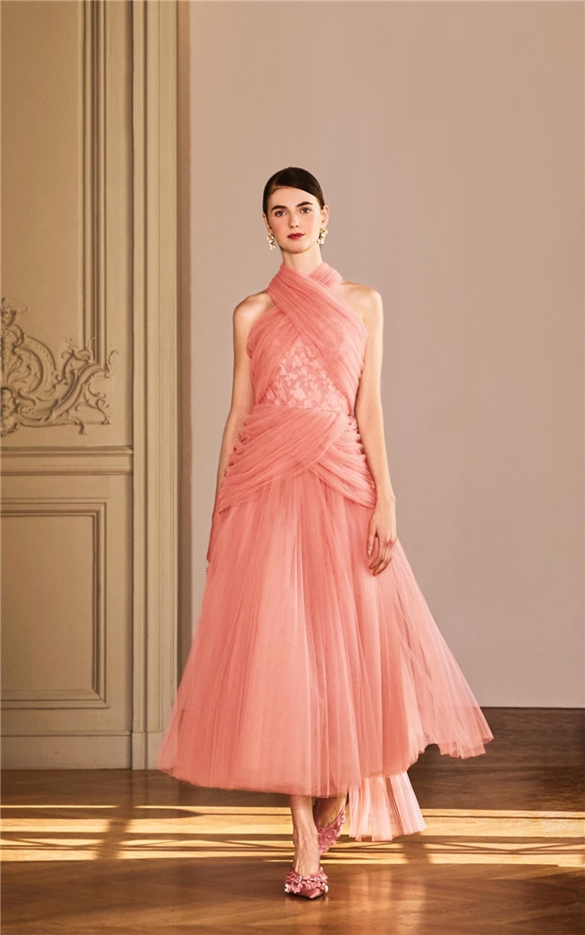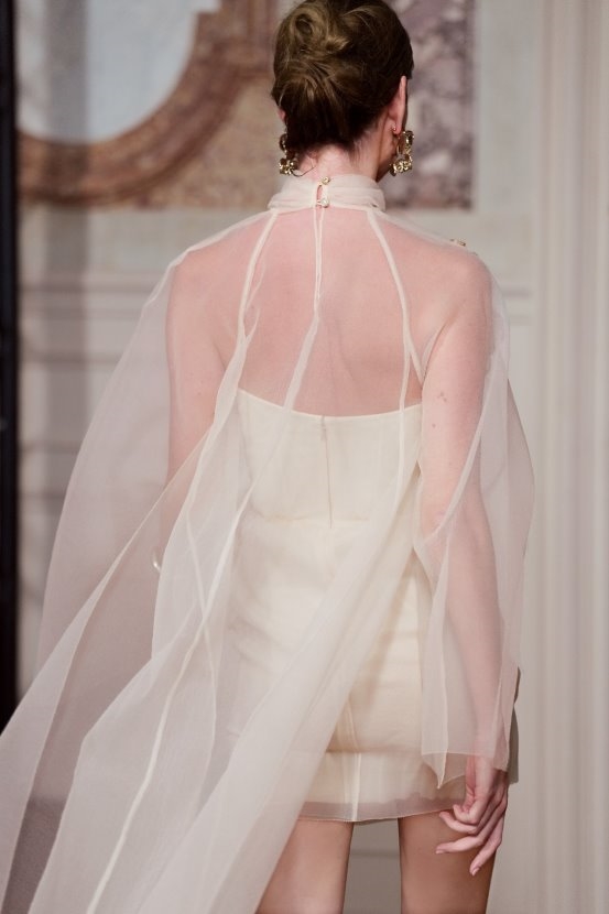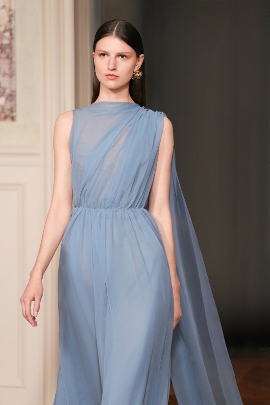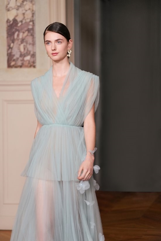 以实验性光影美学为引,借助直接曝光所形成的抽象涟漪与色彩,呼应无拘无束的自由运动概念。该理念与手工褶皱长裙、轻盈薄料及柔和色调完美契合,斗篷裙款、精致刺绣与垂坠结构进一步凸显定制之美。压轴部分融入新古典主义的灵性审美,以隆重袍袖、席地礼服与浓郁红色系升华全场,将诗意与结构、艺术与时装完美结合,致敬经典亦面向未来。